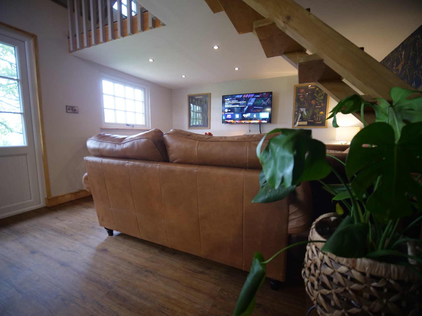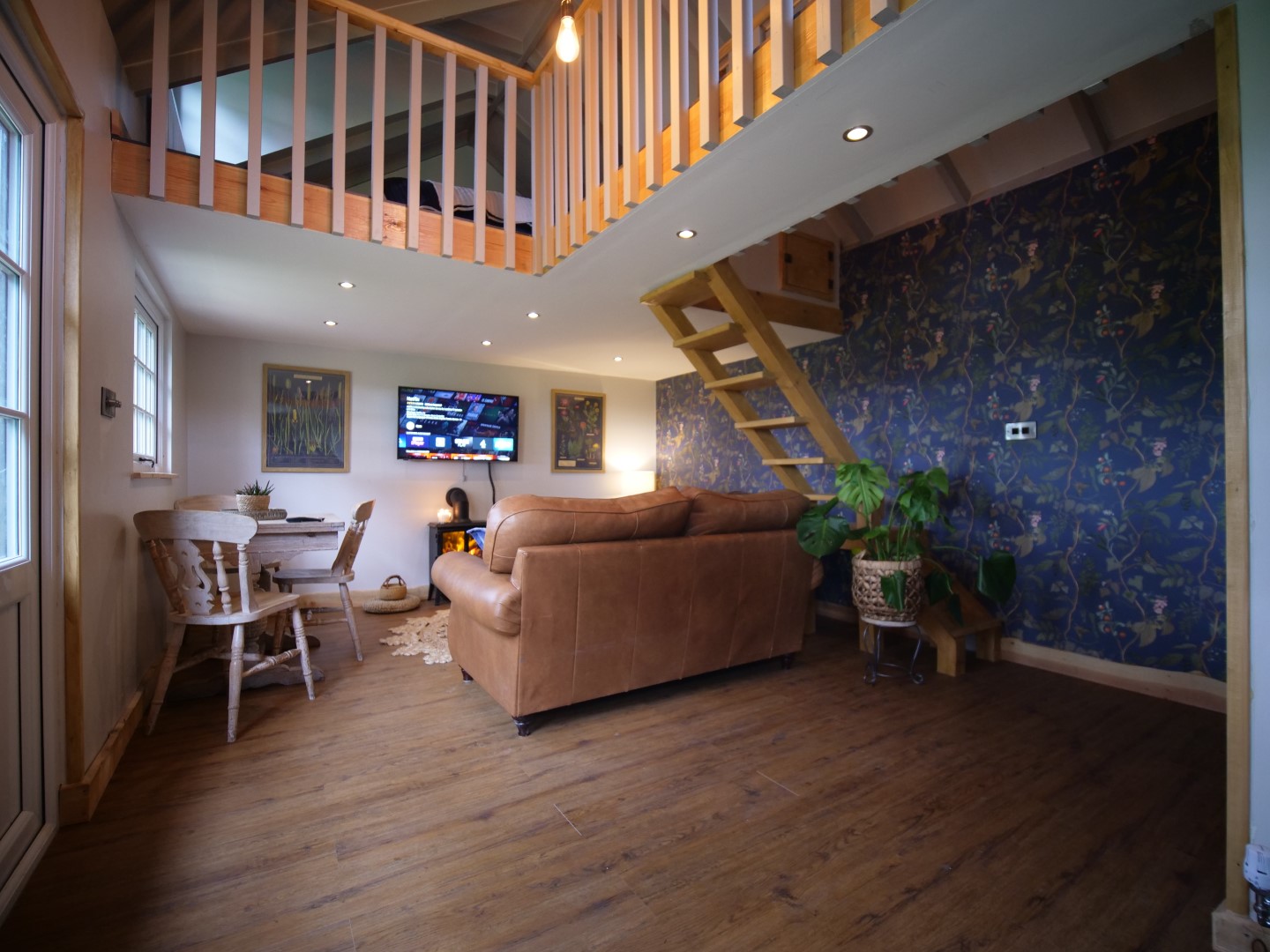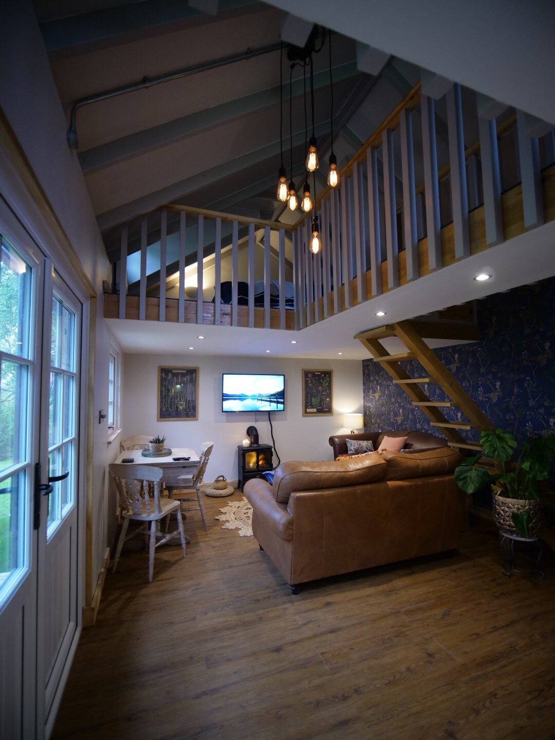 The elevated views from the cabin and its decking are stunning, looking out over the rolling surrounding countryside. The kitchen provides a great cooking space with oven, hob and sink. The living area has a Smart TV, comfy sofa and 2 chairs, a dining table and a stove.